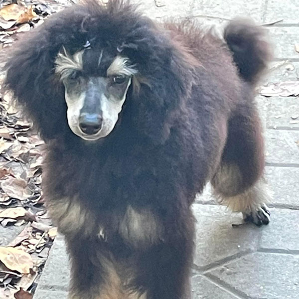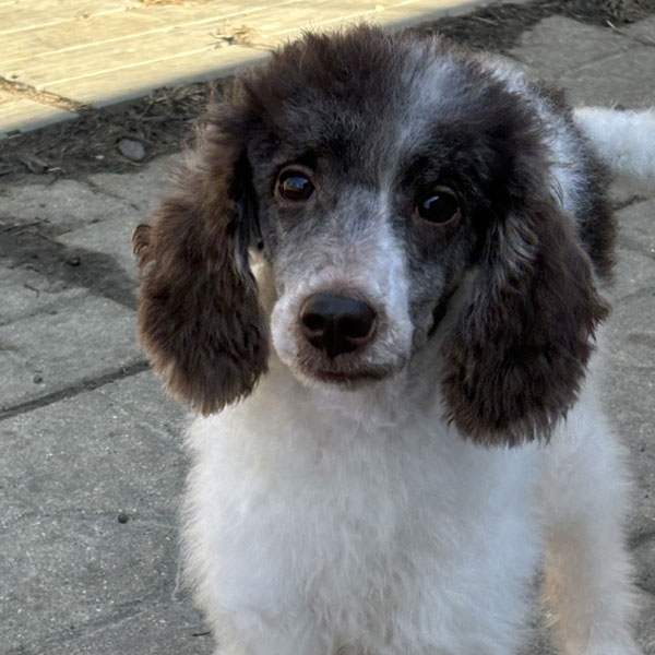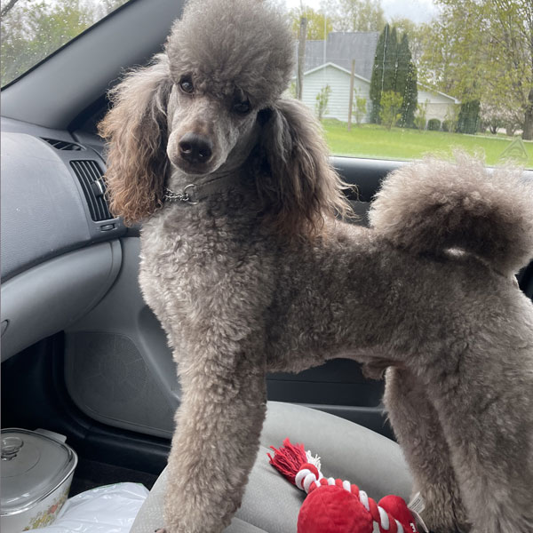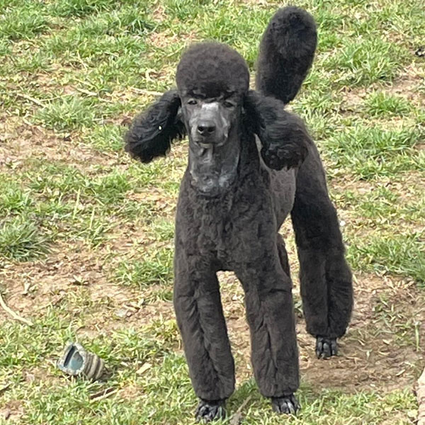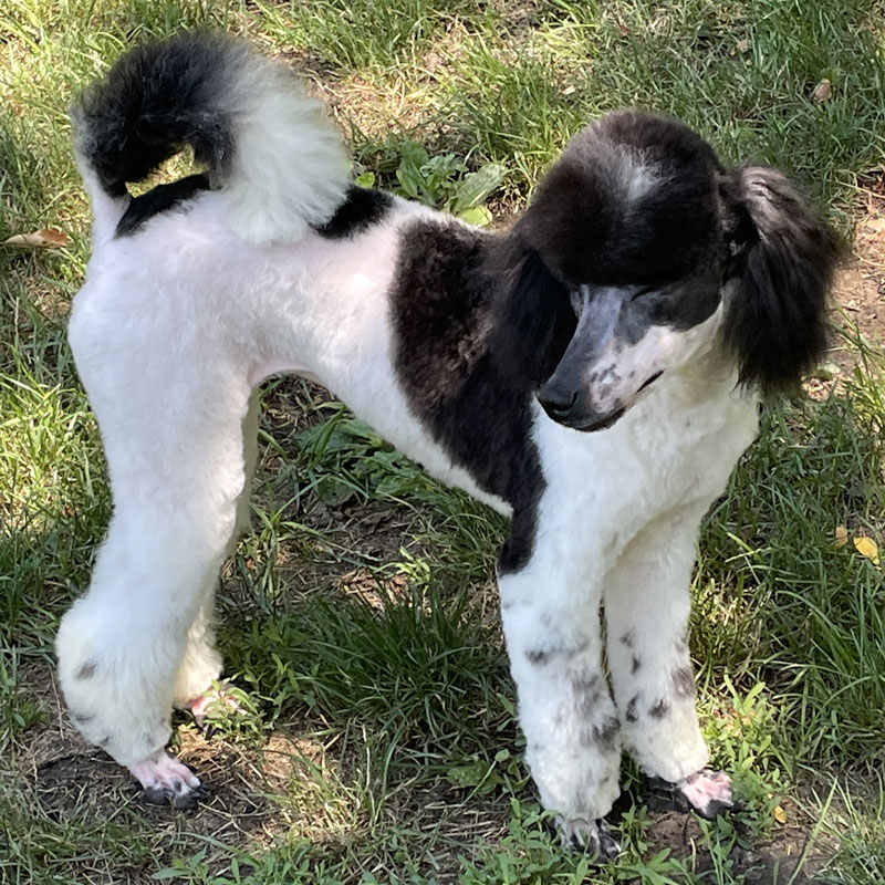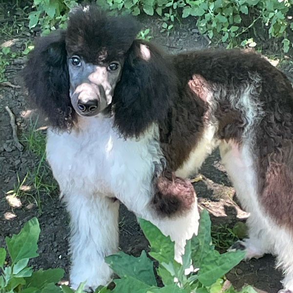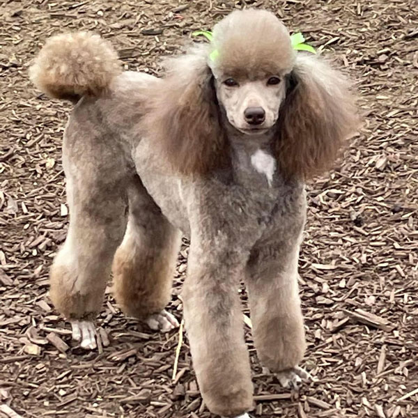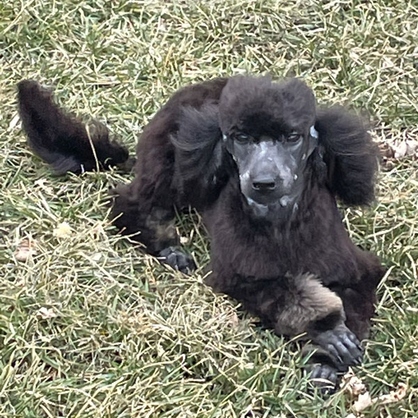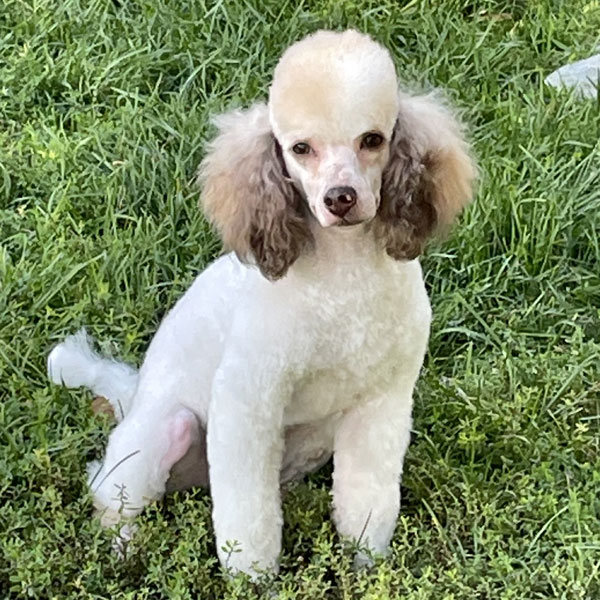Large mini small moyen! She is stunning with a nice square build with a short back. She has a beautiful face – perfect eyes to breed standard almond shaped. Nice neck great angulation. Nice thick coarse dense texture to her coat – and her personality fits the poodle temperament to a tee! Fun loving and extremely smart. Very athletic outdoors and chill in the house with a very nice off switch, very balanced temperament. When she isn’t playing, her favorite pastime is the lap! Not a mean bone in her body – she loves and adores every person that crosses her path!